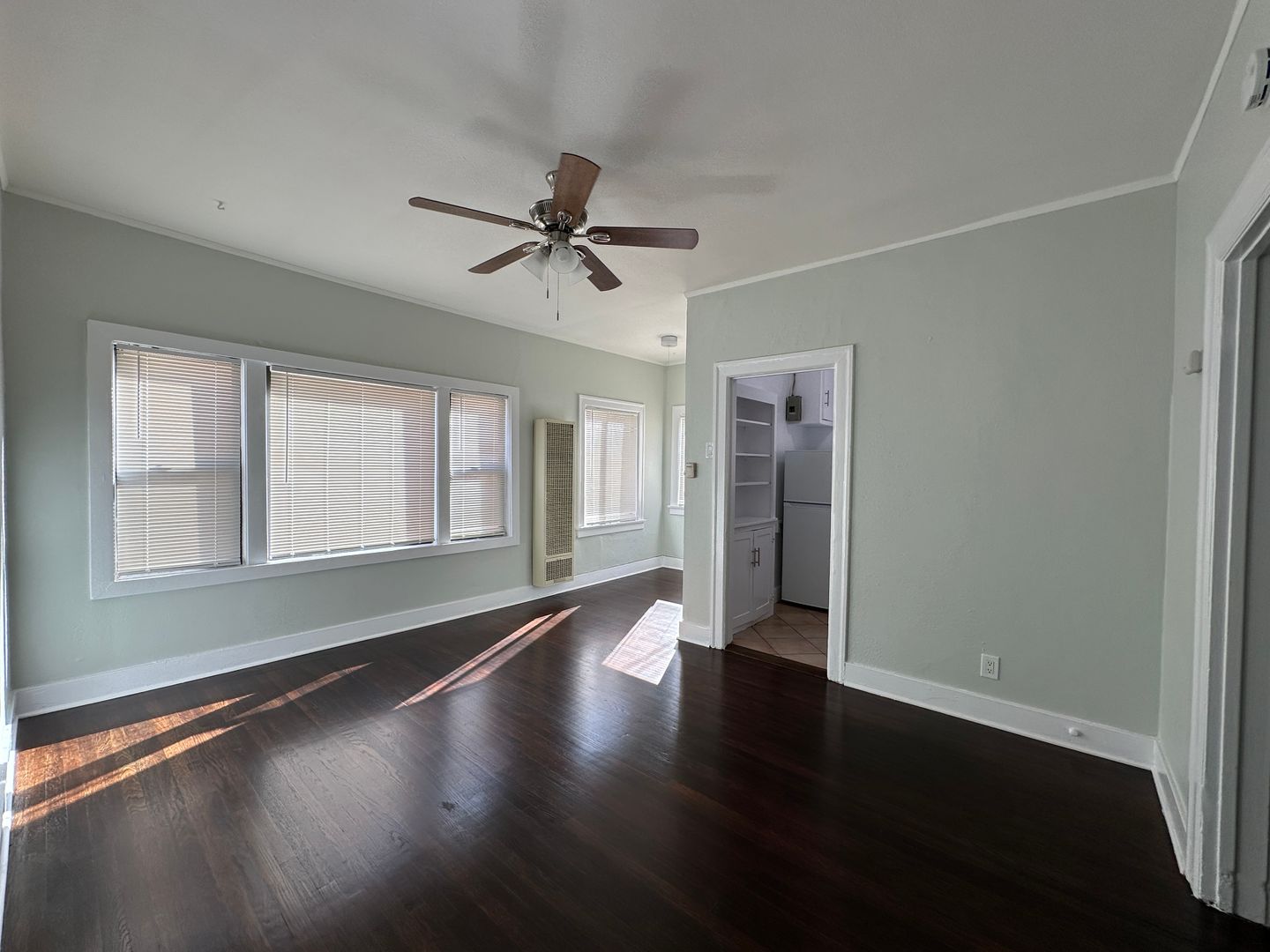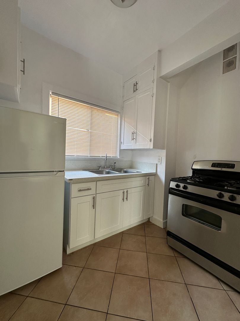 This charming upstairs studio apartment includes fresh two tone paint, refinished hardwood floors, new kitchen counters, walk-in closet, built-ins, fridge and stove.