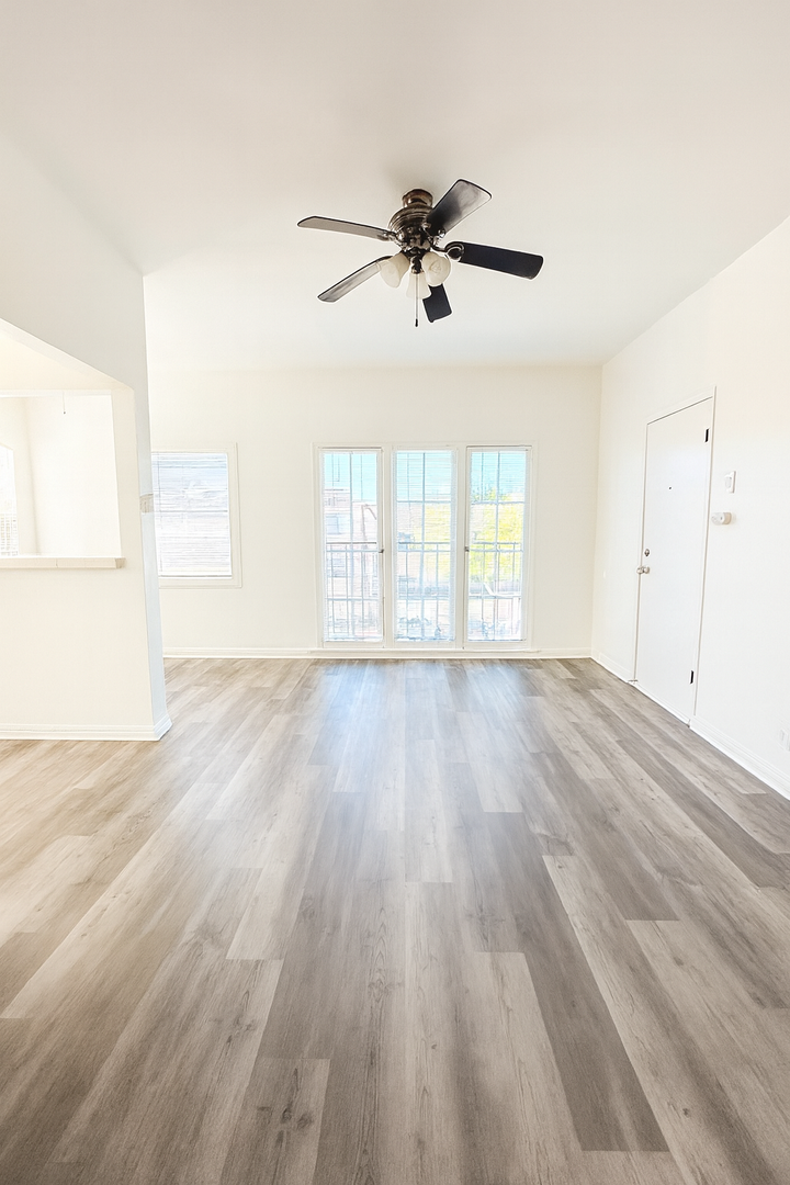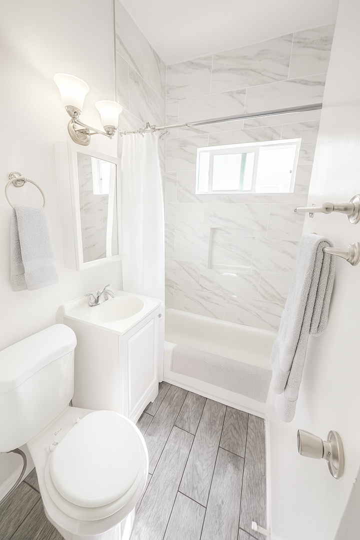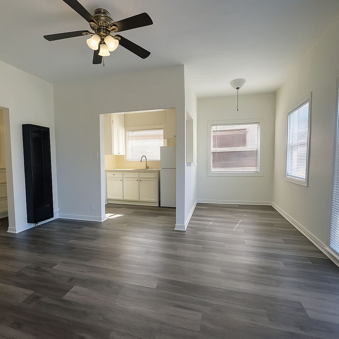 This charming upstairs studio apartment includes fresh paint, wood style plank flooring throughout, large closet/ dressing area, stove, and fridge.