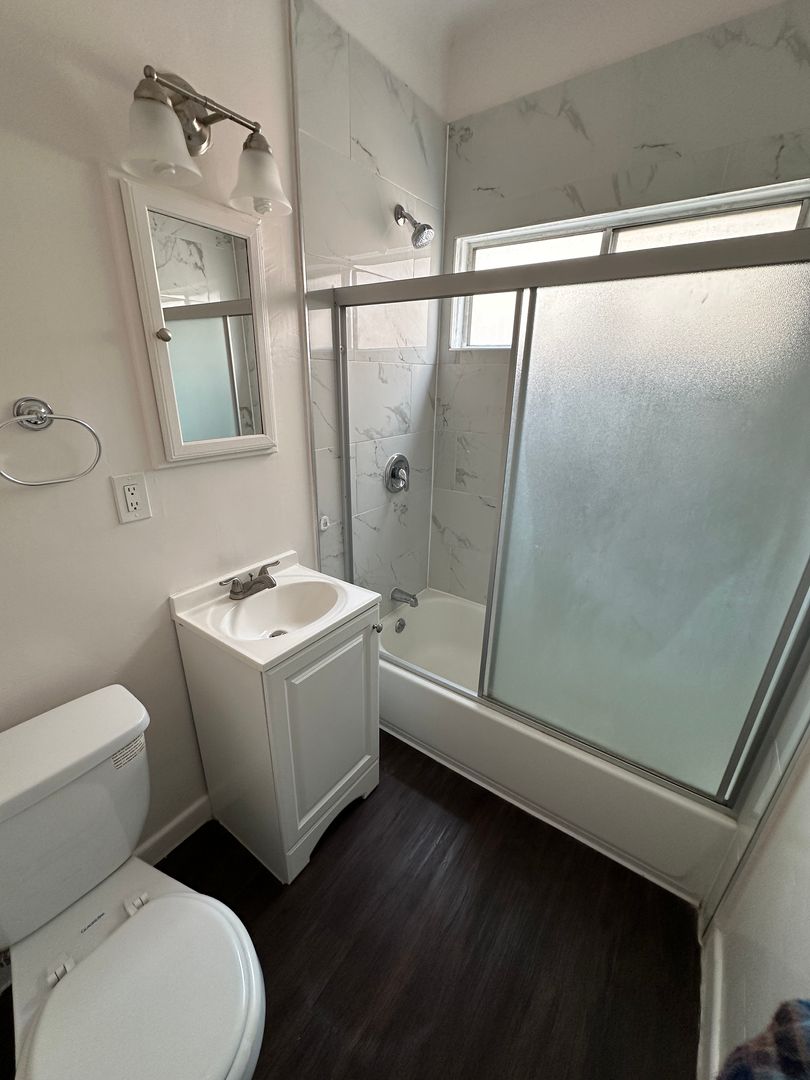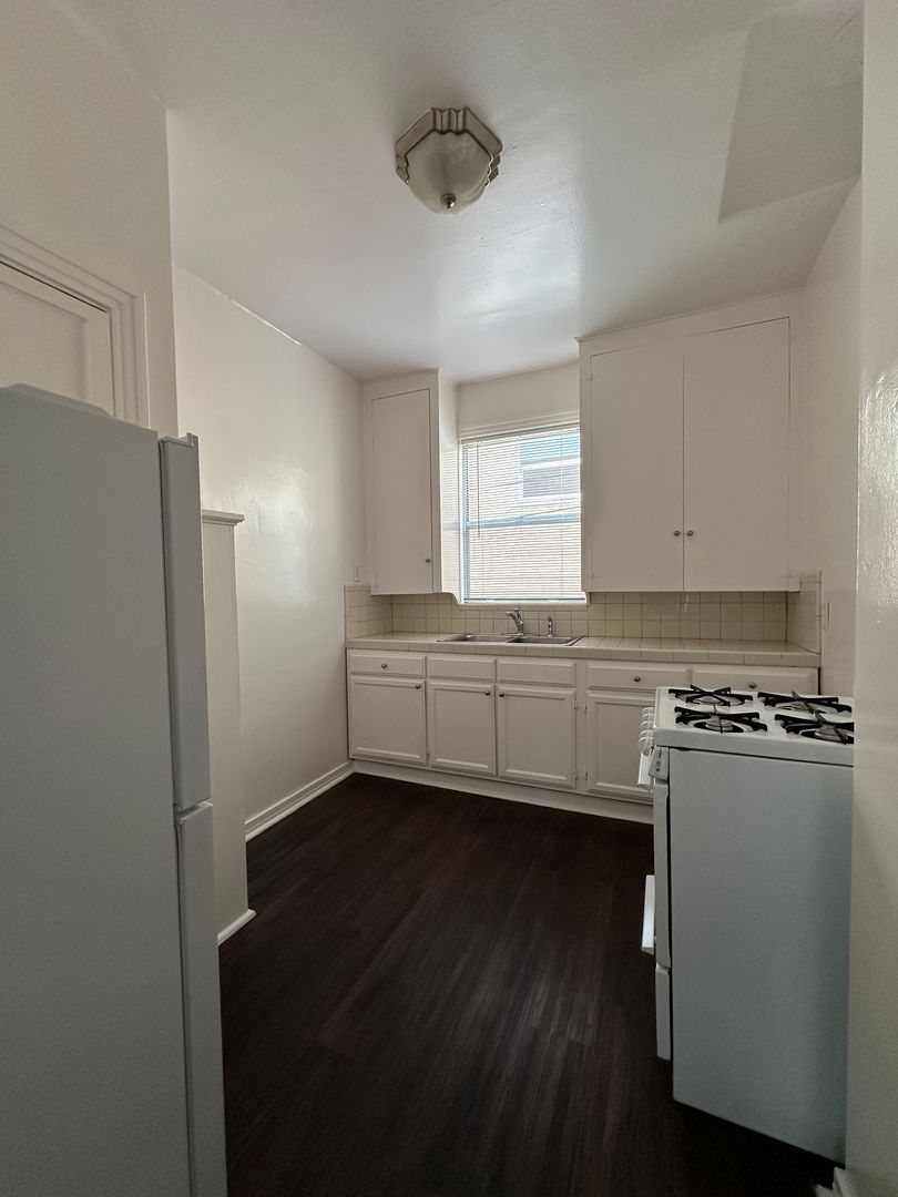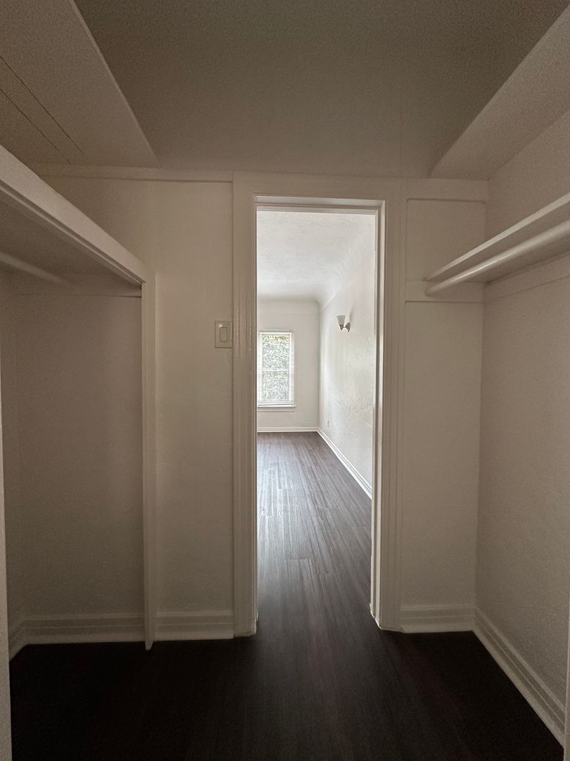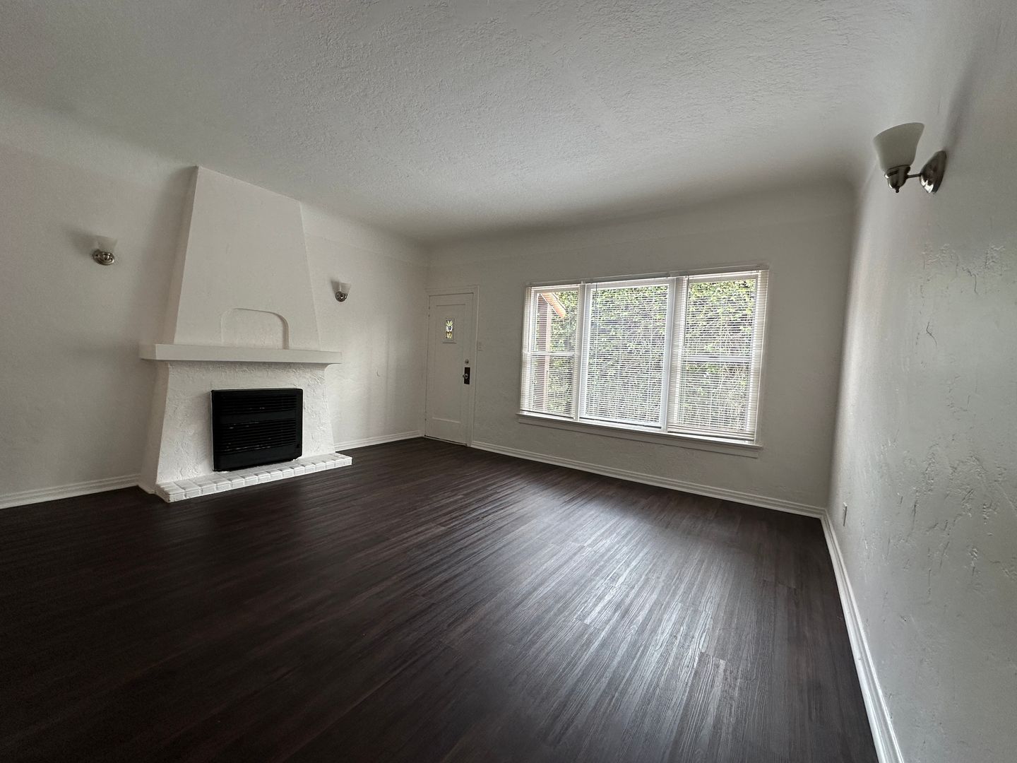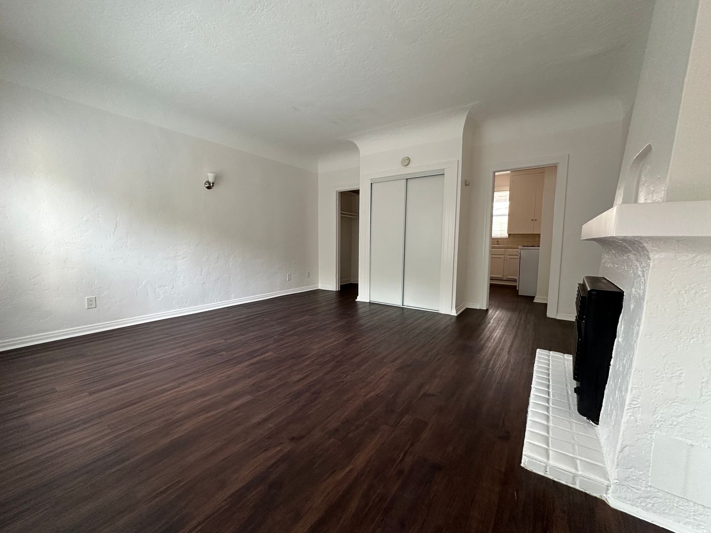 This spacious studio apartment includes fresh paint, new plank flooring, built-ins,faux fire place, stove, fridge and lots of closet space! Water and hotwater are included in the rent.